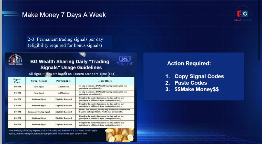 Each trader receives two signals per day, every single day, with the option of a 3rd permanent signal (earned). Bonus trades are warranted to those who invite traders to join (inviting traders to join is not required, if you choose not to participate in wealth sharing).